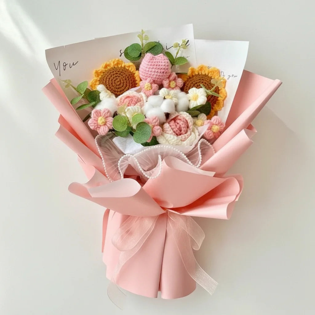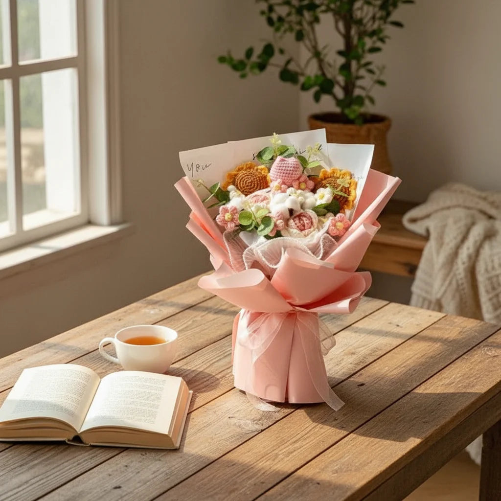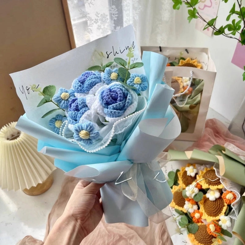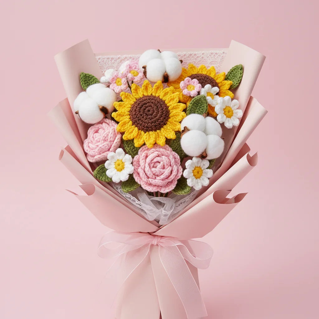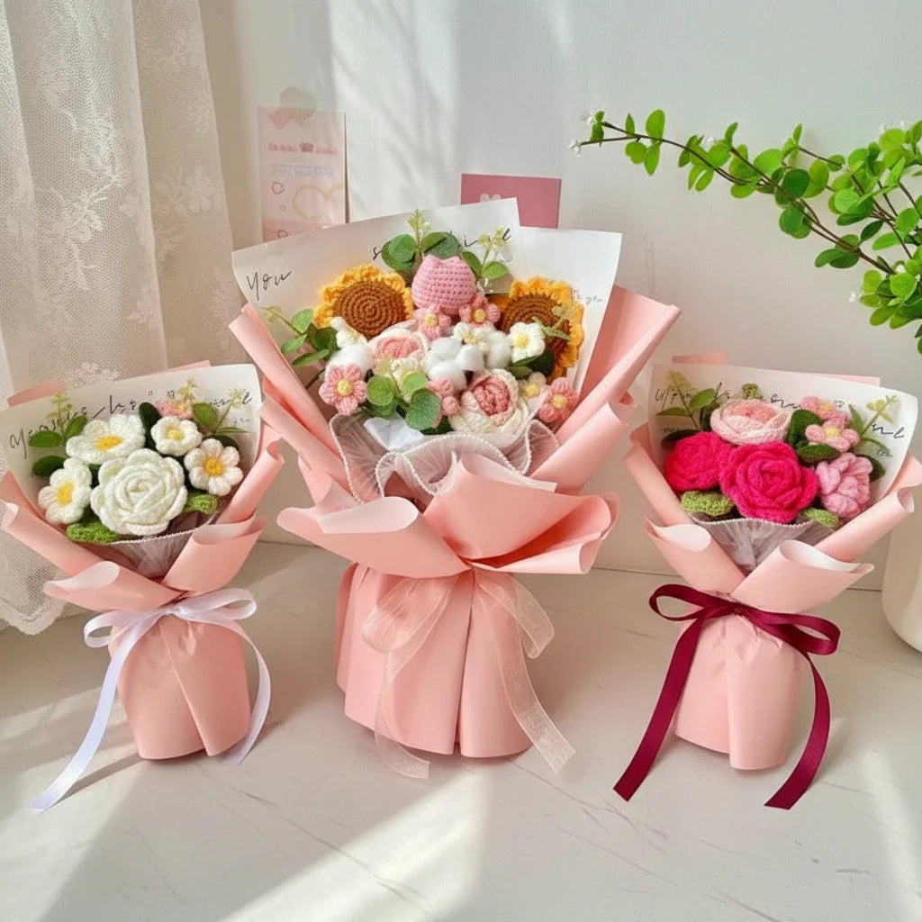 Each bloom is a testament to meticulous hand-craftsmanship, individually knitted with heart and skill by our dedicated artisans. No two bouquets are exactly alike, ensuring your chosen piece is as unique and delightful as a true work of art.
