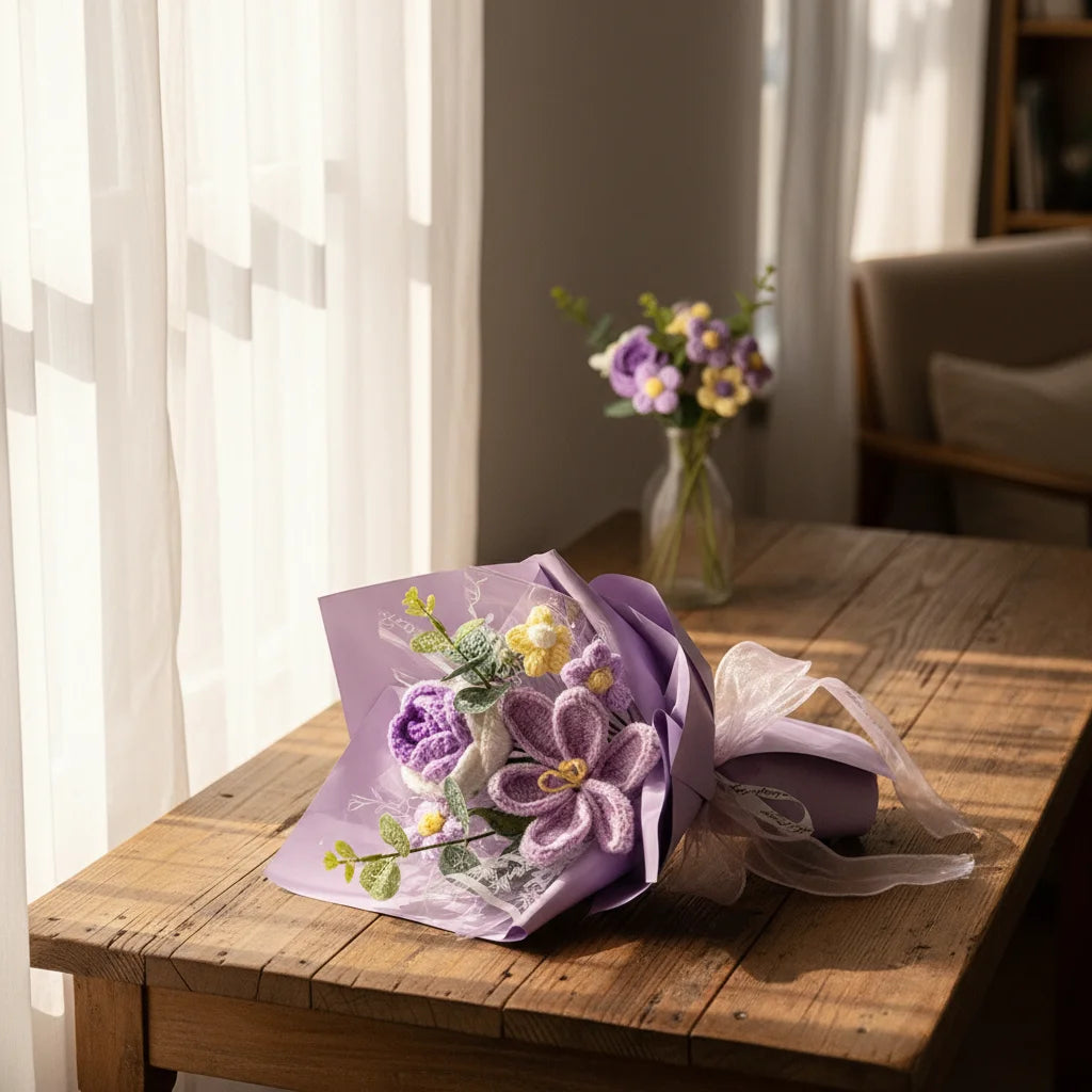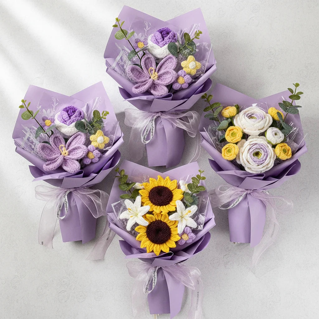 Embrace the everlasting joy of a handcrafted bouquet. Each vibrant bloom is meticulously knitted to create a cherished, unfading memory, bringing enduring charm to any space.